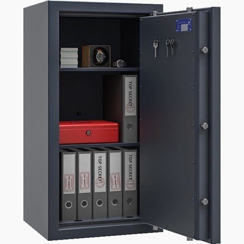 Zamknięcie sejfu realizowane jest zamkiem kluczowym klasa B, klucze L= 135 mm, szt. 2. Zamek elektroniczny w opcji wyposażenia dodatkowego.