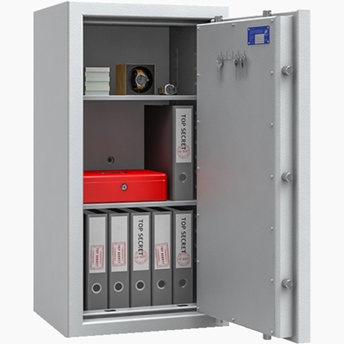 Zamknięcie sejfu realizowane jest zamkiem kluczowym klasa B, klucze L= 135 mm, szt. 2. Zamek elektroniczny w opcji wyposażenia dodatkowego.