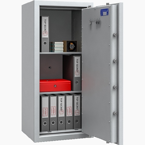 Standardowo zamknięcie sejfu realizowane jest zamkiem kluczowym klasa B, klucze L= 135 mm, szt. 2. Zamek elektroniczny w opcji wyposażenia dodatkowego.